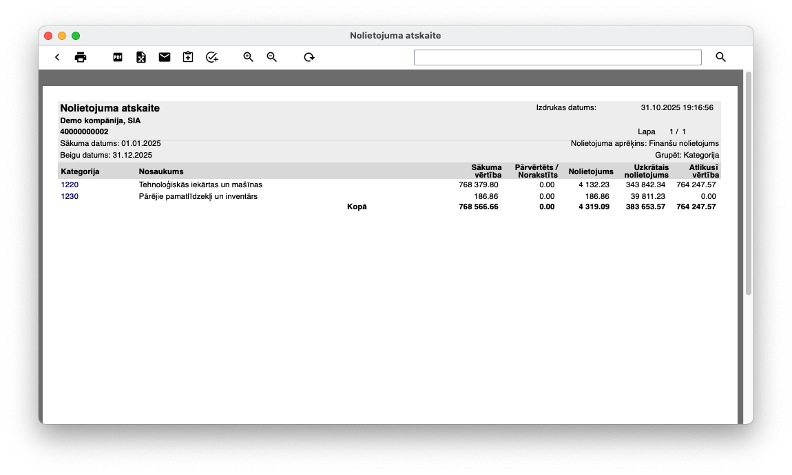 Modulis Pamatlīdzekļi > Atskaites > Nolietojuma atskaite