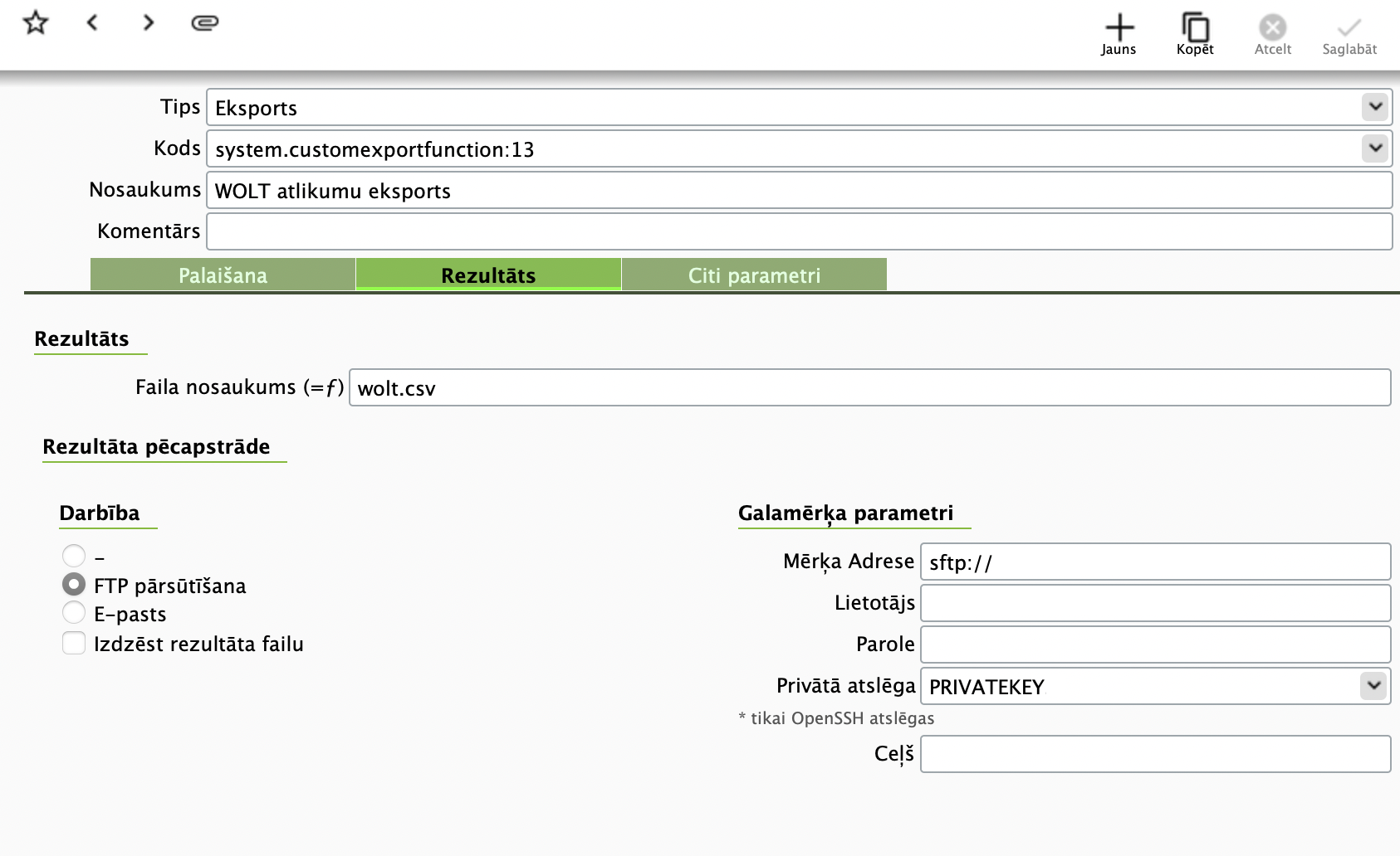 - Mērķa adrese - FTP servera adrese, ko saņem no Wolt, priekšā jābūt pieliktam sftp://