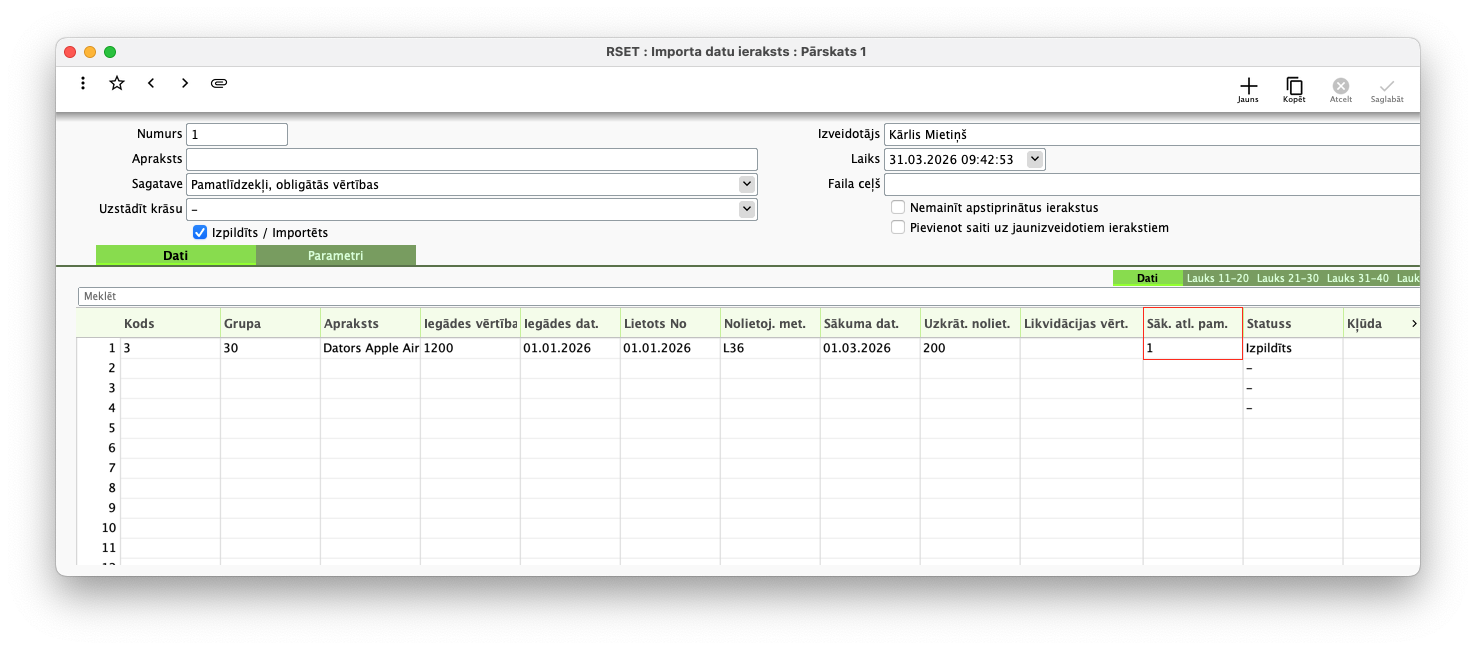 - Modulis Pamatlīdzekļi > Importi > Sākuma atlikumu PL imports