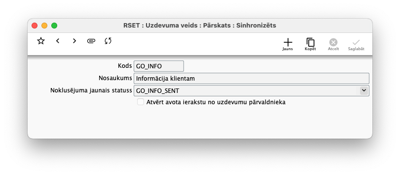 - Noklusējuma jaunais statuss - norādiet noklusējuma uzdevuma statusu, ja tiek veidots jauns uzdevums ar šo veidu. Sistēma piešķirs automātiski noteiktu uzdevuma statusu. Visbiežāk katram uzdevumu veidam būs kāds noklusējuma sākuma punkts, piemēram izdevumu apstiprinājuma procesam tas būs "Nepieciešams apstiprināt", bet pārdošanas procesā tas varētu būt "Jāsagatavo piedāvājums".