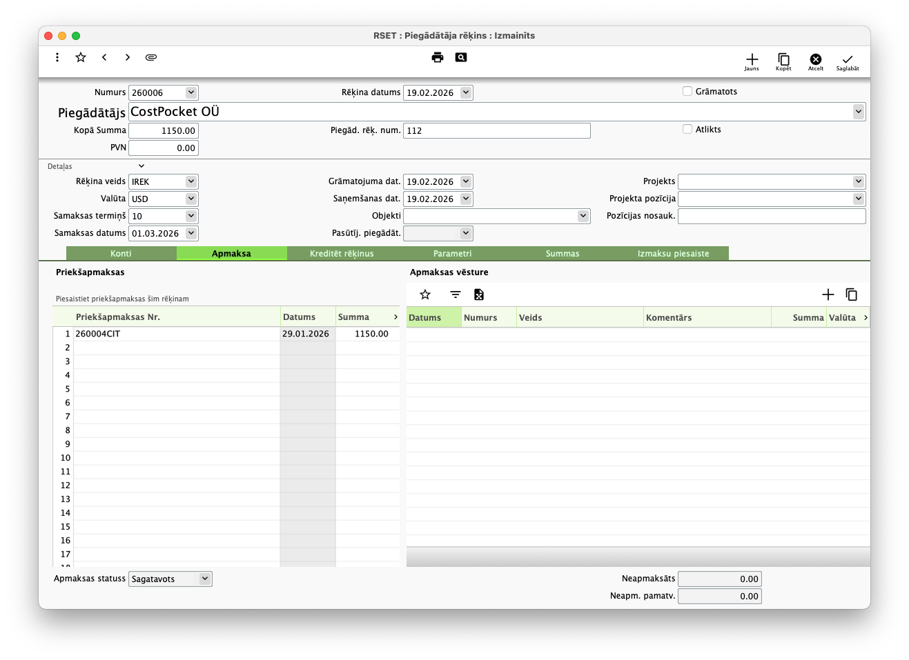 Ja Maksājuma uzdevumā bija norādīta plānotā valūtas summa, tad Rēķinam, sadaļā Apmaksa būs pieejama iepriekš veidotā Priekšapmaksa, kas šajā gadījumā nosedz norādīto 1150 USD summu.