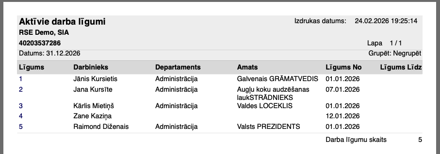 - Modulis Algas > Atskaites > Aktīvie darba līgumi