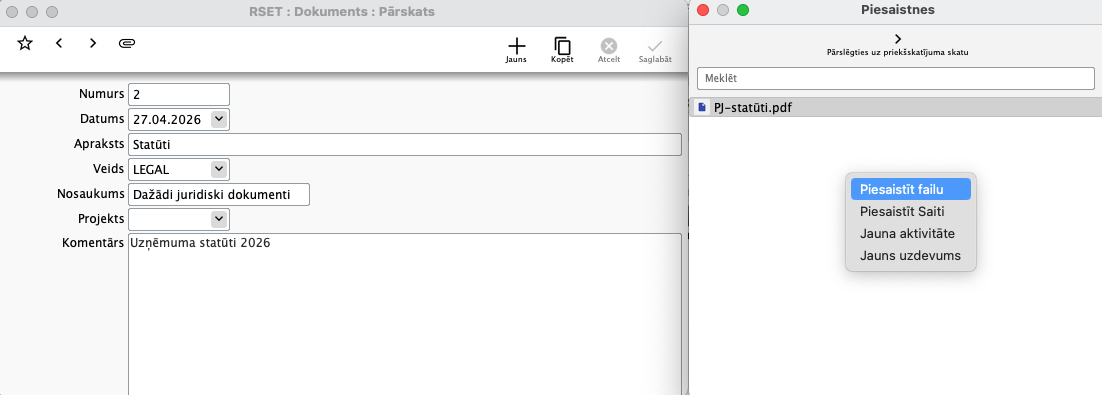 - Projekts - ja tiek izmantots Projektu modulis, tad dokumentiem, kas attiecas uz konkrētu Projektu, iespējams norādīt Projektu.