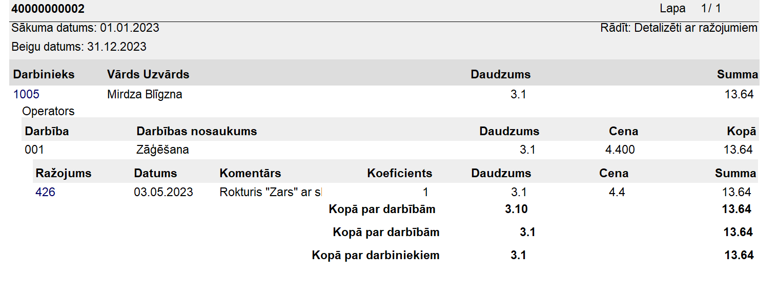 Atskaite izvadīs vēlamajā detalizācijā artikulu kopsavilkumu ar to daudzumiem un pašizmaksām.