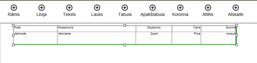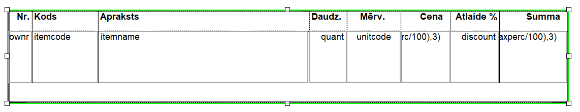 Izveidojiet jaunu izdrukas formu. Šajā formā uzzīmējiet tabulu cenas aprēķina vajadzībām. Šī forma tiks izmantota kā apakšforma un 'iegulta' piedāvājuma izdrukā zem katras artikula rindiņas.