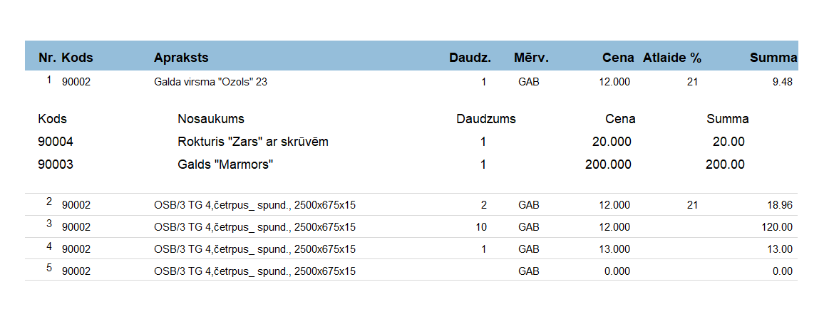 Ar šīm darbībām ir jāpietiek, lai ieraksts, kurā ir kāda rinda ar cenu aprēķinu, izdrukā izskatītos līdzīgi zemāk redzamajā attēlā.