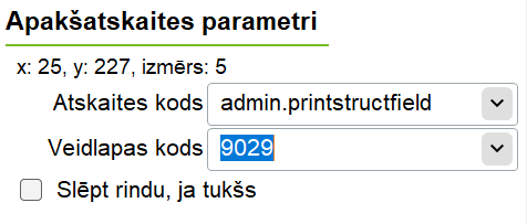 Pēc atskaites norādīšanas redaktora logs ir jāatjaunina - iezīmējiet formu redaktorā kādu citu elementu, tad atkal iezīmējiet apakštabulas elementu. Zem norādītā atskaites koda parādīsies atlases parametri minētai stukturēto artikulu izdrukas atskaitei.