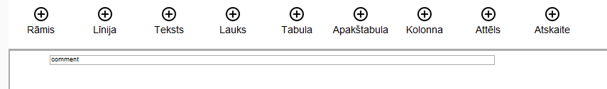 Augšminētajā piemērā ir apskatīts gadījums, kad nepieciešams izdrukāt cenu aprēķinu. Cenu aprēķins ir ieraksts, kurš satur tabulu. Gadījumos, kad jāizdrukā paplašinātais komentārs, šajā apakšstruktūrā nav tabulas, ir tikai viens liels teksta lauks, tādēļ paplašinātā komentāra izdrukas iespējai nepieciešams veidot nevis tabulas elementu, bet elementu Lauks. Paplašinātā komentāra apkakšizdruka formu redaktorā izskatīsies līdzīgi zemāk norādītai: